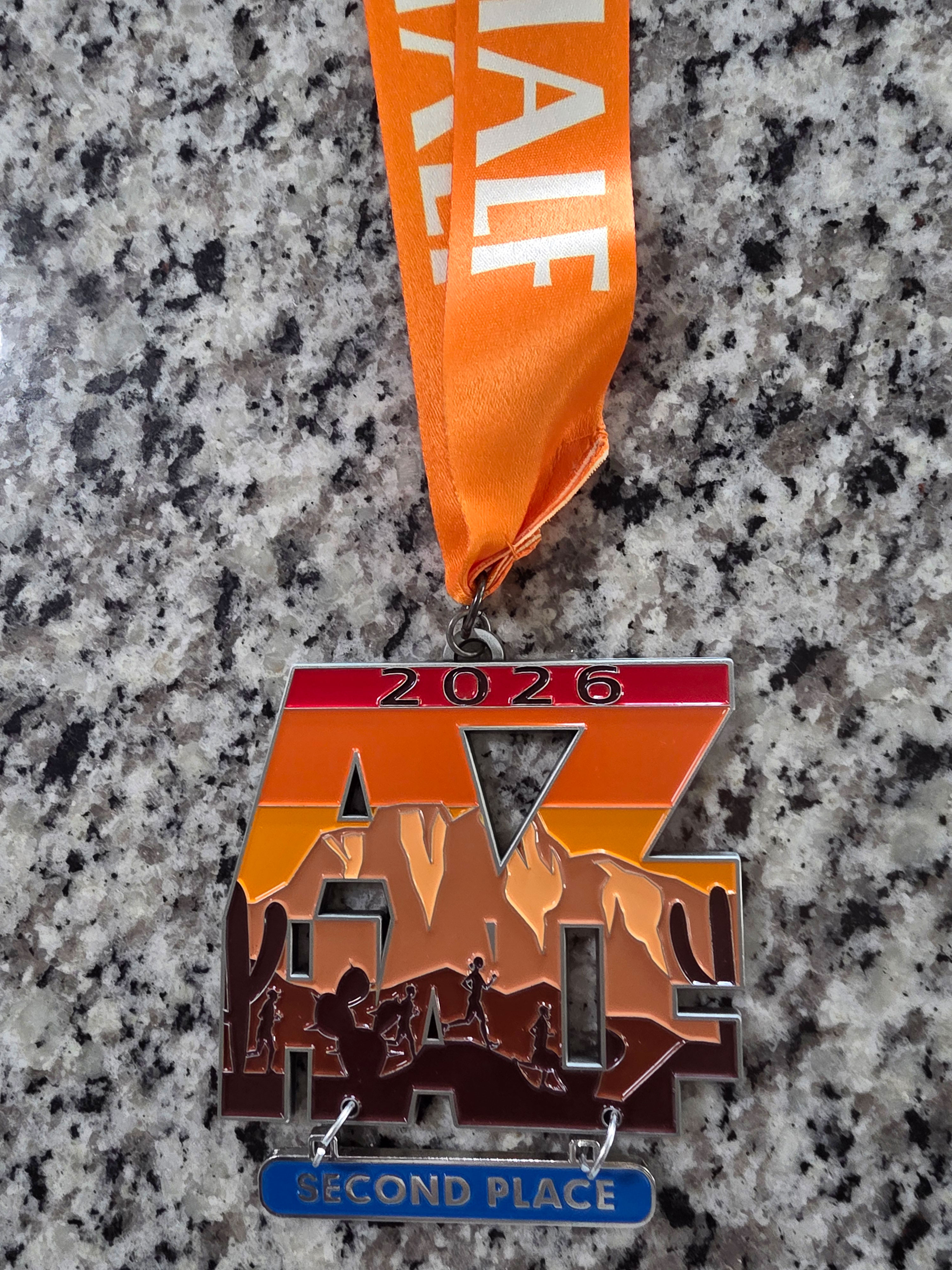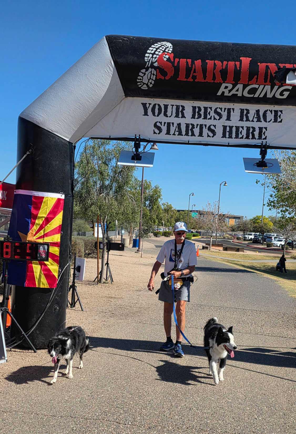 AZ VETERANS 1/2 MARATHON, NOVEMBER 9, 2025, PEORIA, AZ (with Blue and Suri) TIME 3:20:58, PACE 15:60 no profile of the course as basically flat with only 195 ft of ascent FINISH 50th, 1st in 75+ AGE GROUP |